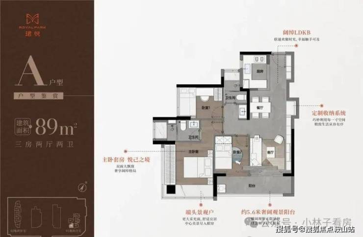 89㎡的3房2厅2卫,A户型(1栋1单元06户型),设计的是经典竖厅格局,进门入户玄关,LDKB一体化,S墙设计预留冰箱卡槽位,三开间朝南,动静分区,主卧双面大飘窗,客厅连接次卧出5.6米长的观景阳台,U型厨房,公卫三段式分离,得房率76.78%(不含赠送),套内面积69.1㎡,东南朝向。