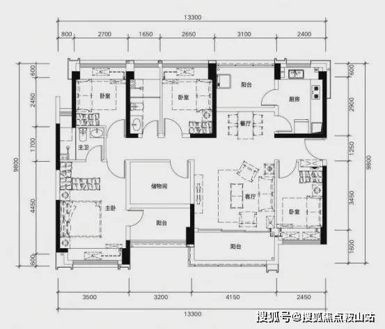 ✅ G01户型:约135㎡ 五房两厅两卫: