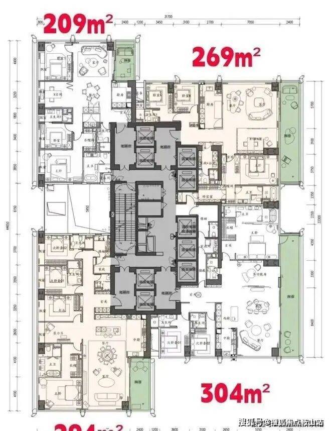 •低区户型(20-30层):主力209㎡三房两厅三卫,部分楼栋分布269㎡四房两厅三卫,格局方正,全明通透,适配高端改善家庭,推窗可赏社区园林与城市中景。