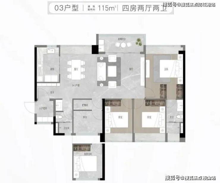 115方四房,横厅设计无过道浪费,三开间朝南南北通透,餐厅、客厅、主卧均可望江,视野开阔。