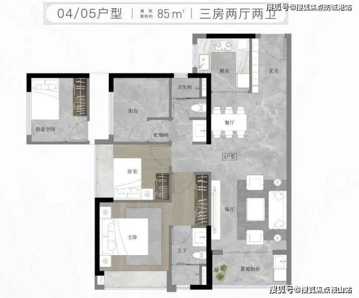 85方为1栋中唯一南向户型,竖厅设计,南望小区园林,2+1房2厅2卫,LDK一体化设计,动线流畅布局合理,主卧带有步入式衣帽间、独立卫浴,可谓麻雀虽小五脏俱在。