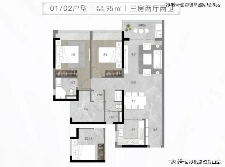 95方三房,北向阳台一线望江,拥有270度环幕视野,传统竖厅设计,动静分区合理。