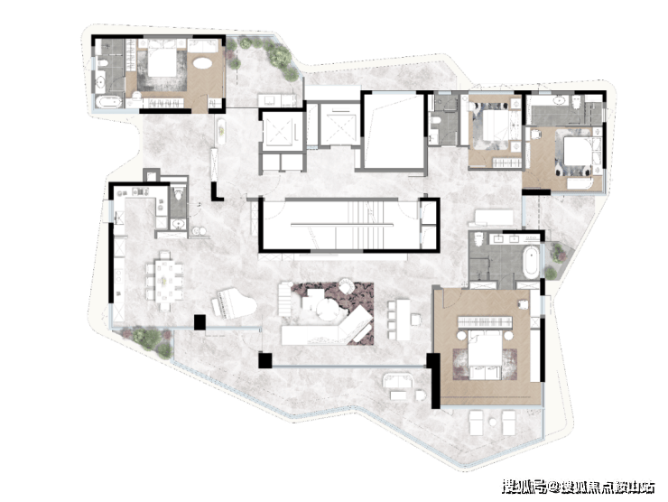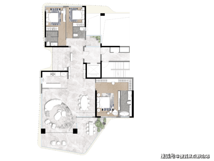 这个户型同样为3+1,3卫双套房设计,不过布局上有不同。