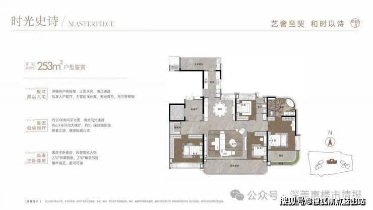 253平是四房两厅两卫户型,竖厅设计,南北对流,阳台有10米长,特点是主卧的飘窗和主卫都是270度弧形采光面,视野采光一流。