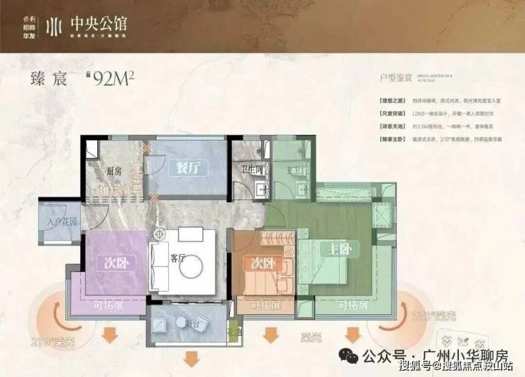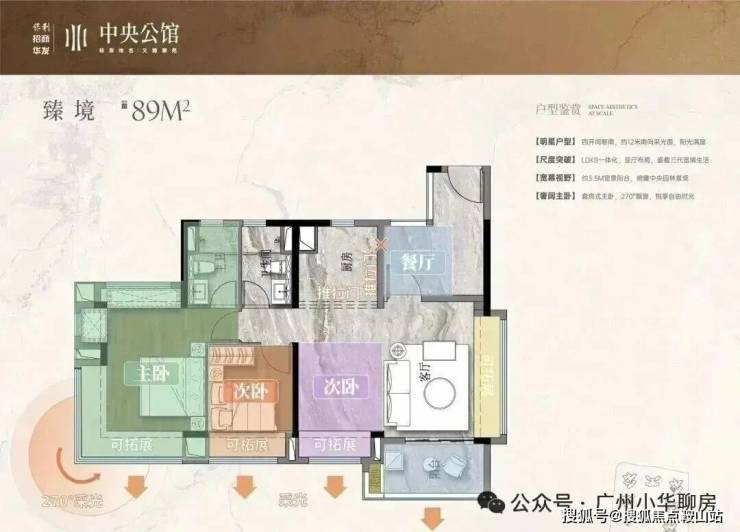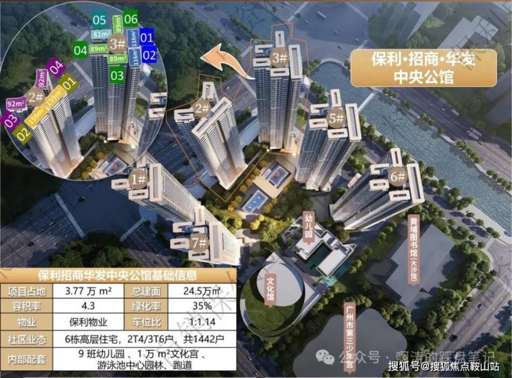 保利招商华发中央公馆采用了围合式设计,6栋47层高塔楼设计,小区自身配建有文化体育场馆和幼儿园,除了2#楼王是两梯四户,其余均为三梯六户,8#是5层高的文化馆,9#是配建3层高的幼儿园。