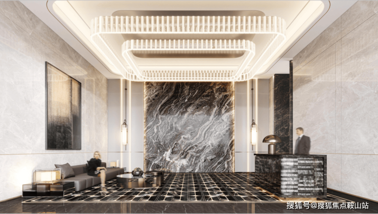 小区采用酒店式门楼入堂,对标国际级酒店打造,门口选取名贵精品罗汉松造景,水景石材选用蓝钻石材,满满的仪式感和尊贵感。