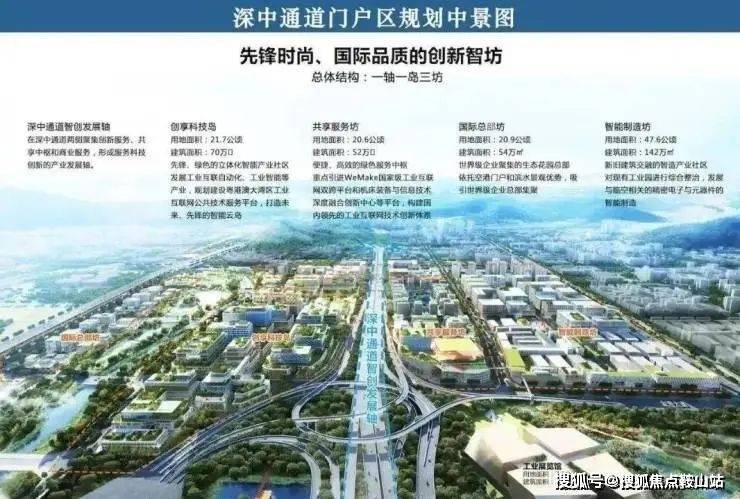 从功能上,该片区以创新驱动城区,以优质景观带串联多种产业平台,构建「深中通道智创发展轴、创享科技岛、共享服务坊、国际总部坊以及智能制造坊」的“一轴两湾,一岛三坊”新价值格局,再造一座科技岛,加速深中融城。