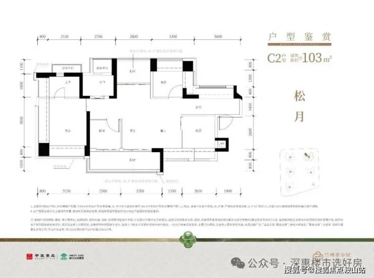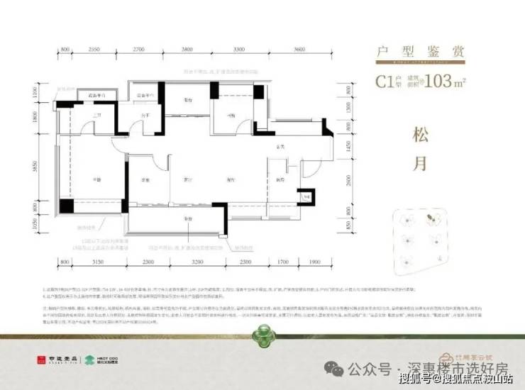 103㎡的4房2厅2卫,设计的是横厅南北通透格局,进门赠送约4㎡入户玄关,客餐厅5.7米开间,分别做到了主卧17.73㎡/次卧9.5㎡/次卧8.12㎡/次卧6.88㎡(包含墙体飘窗),主卧+1个次卧270°飘窗,U型厨房,卫生间干湿分离,得房率约106.3%(包含赠送),客厅连接次卧出5.7米长大阳台约9.4m²,西南朝向。飘窗赠送面积17.6m²+阳台赠送面积7.64m²+设备平台3.93m²=实际赠送面积约29.17m²。