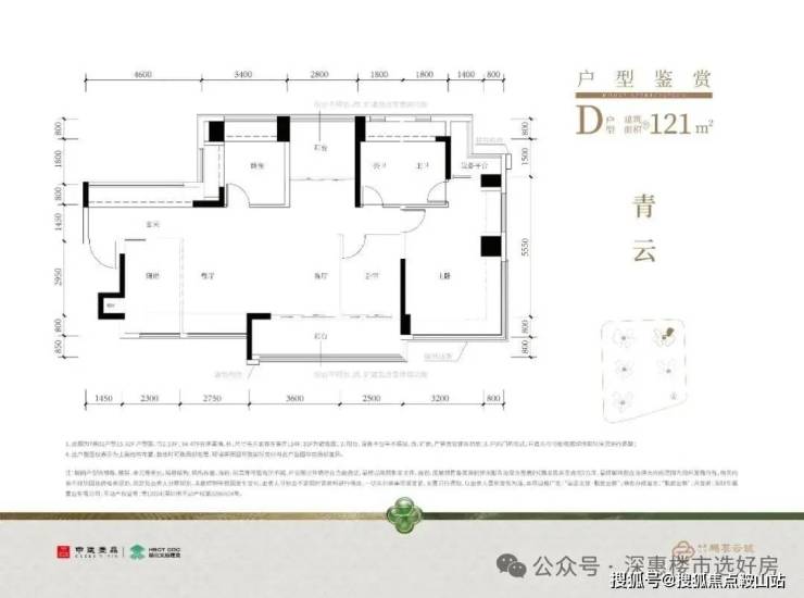 121㎡的4房2厅2卫,设计的是横厅南北通透格局,进门赠送约4.6㎡的入户玄关(不计算在户型图内),客餐厅6.35米开间,LDKB一体化设计,分别做到了主卧22.5㎡/次卧11.56m²/次卧9.52㎡/次卧7.38㎡(包含墙体飘窗),主卧带设备平台,L型厨房,卫生间干湿分离,得房率约106.49%(包含赠送),客厅连接次卧出6.1米长大阳台约9.76m²,东南朝向。飘窗赠送面积23m²+阳台赠送面积8.52m²+设备平台2.96m²=实际赠送面积约34.48m²。