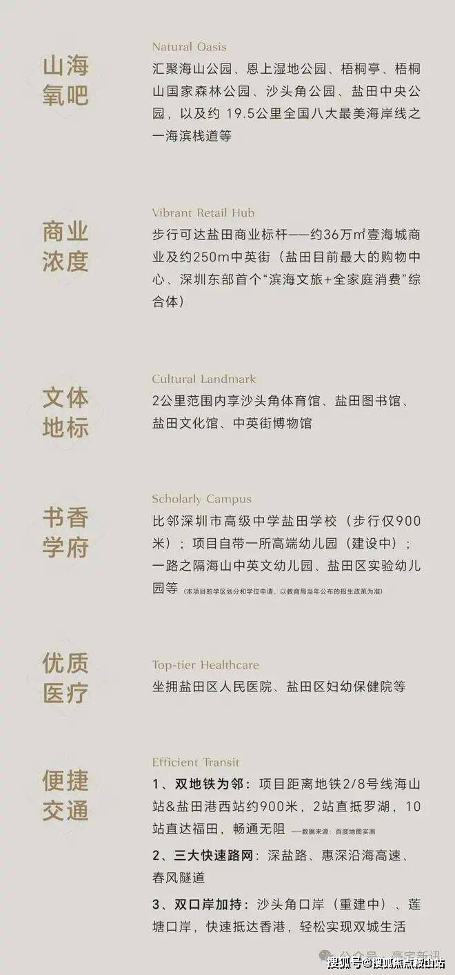 ———项目卖点———坐落盐田区政府旁,背山面海,地理位置绝佳,紧邻中国最美八大海岸线之一,盐田海滨栈道……自然环境纯粹,负氧离子含量高,是深圳全年空气指数最优片区之一,且步行15分钟内生活配套齐全497户纯住宅大户型社区,4T4户,纯新规住宅,使用率超100%!小区纯粹,未来更受欢迎!深圳唯一0距离登山道,可30分钟登顶恩上湿地公园梧桐亭、4600平的文体中心等自然配套2/8号线海山站,4站到莲塘口岸,毗邻口岸枢纽交通中心