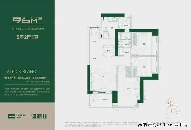 建面约96㎡3房2厅1卫:经典竖厅设计,户型方正、动静分区,双阳台设计,厨房生活阳台也不小,有西南、东北两个朝向可选。