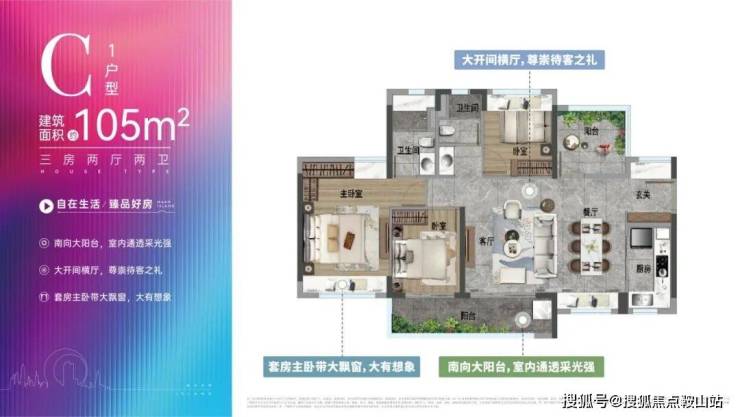 这个户型做了大横厅设计,且五开间朝南、南向大阳台连接客厅与次卧、玄关带飘窗、主卧带南北双飘窗,都大大提升了室内采光。