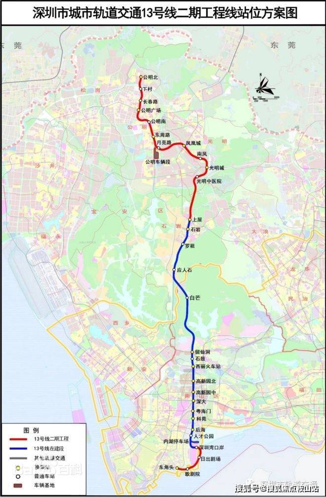 ①13号线及其南、北延长线(建设中,预计2025年开通)起于东角头站,终于公明北站,纵贯光明、宝安、南山,线路开通后约30分钟可抵达南山核心区,约45分钟可达深圳湾口岸,以高新技术人才为主要客流,被称为高新技术人才专线