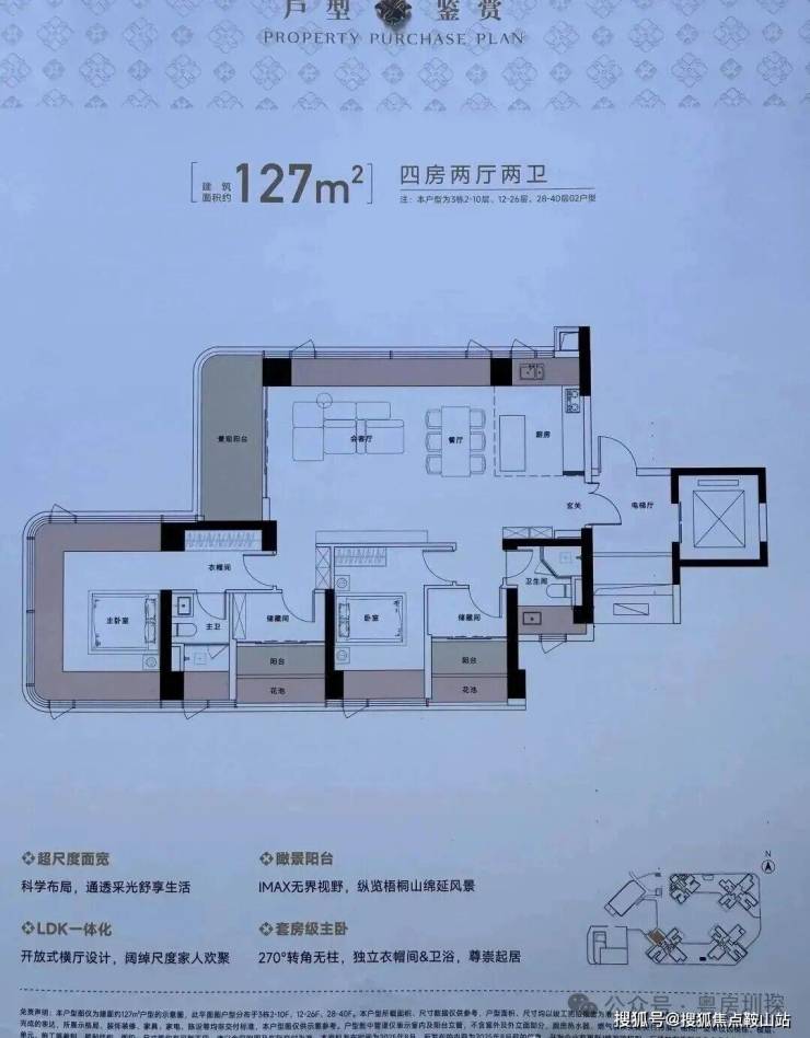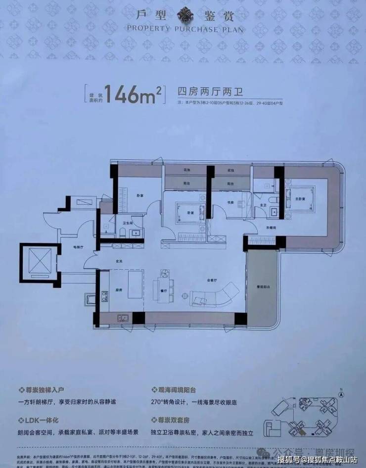 将地标高度/创新设计/极致景观/自然融合四大要素集于一体,约150米地标建筑以45°错位转体设计,实现四户分踞四角的独立瞰景布局,每户均可享有极致山海景观。约55米超宽楼间距、0.6的黄金窗墙比远超常规住宅0.3-0.5的标准,呈现山景、海景、花园三重景观界面。