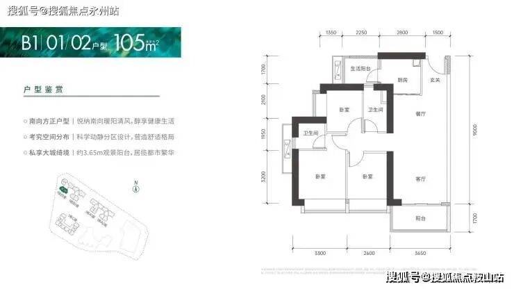 105㎡的3房2厅2卫:设计的是竖厅格局,客厅3.65米开间,进门入户玄关,LDKB一体化设计,3个卧室分别做到了3.3米/2.6米/2.5米的宽度,L型厨房还带1个小生活阳台,卫生间干湿分离,得房率:72.01%(不含赠送),阳台朝西南向。