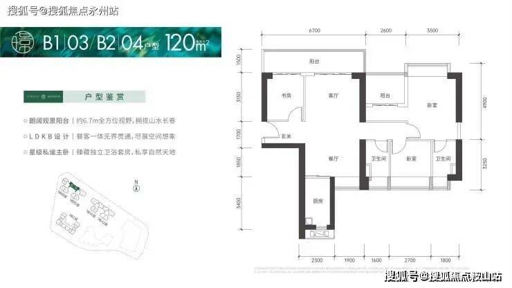 120㎡的4房2厅2卫:设计的是竖厅南北通透格局,客厅4.2米开间,进门入户玄关,LDKB一体化设计,4个卧室分别做到了3.5米/2.7米/2.6米/2.5米的宽度,客厅连接次卧出6.7米长的大阳台,L型厨房,卫生间干湿分离,得房率:72%(不含赠送),阳台主朝东北向。