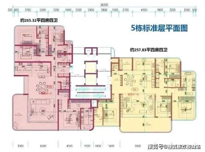 2梯2户分布于2、3、5、8、9单元,层高约3.5米,主打193-332㎡大平层,涵盖4房2卫至4房5卫多种配置。