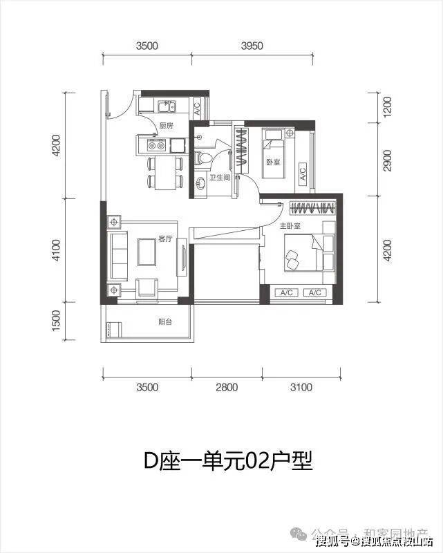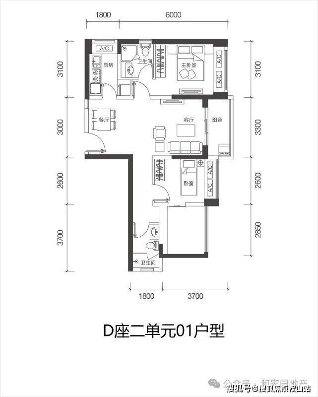 D栋一单元02户型:88㎡ 3房2厅1卫