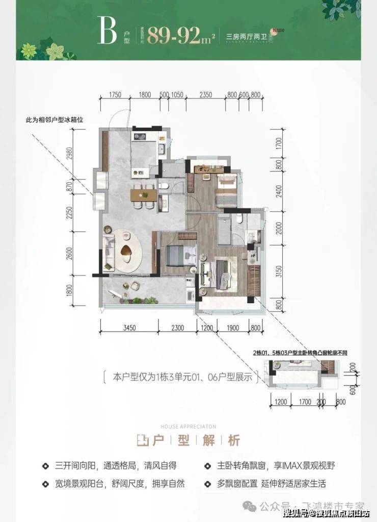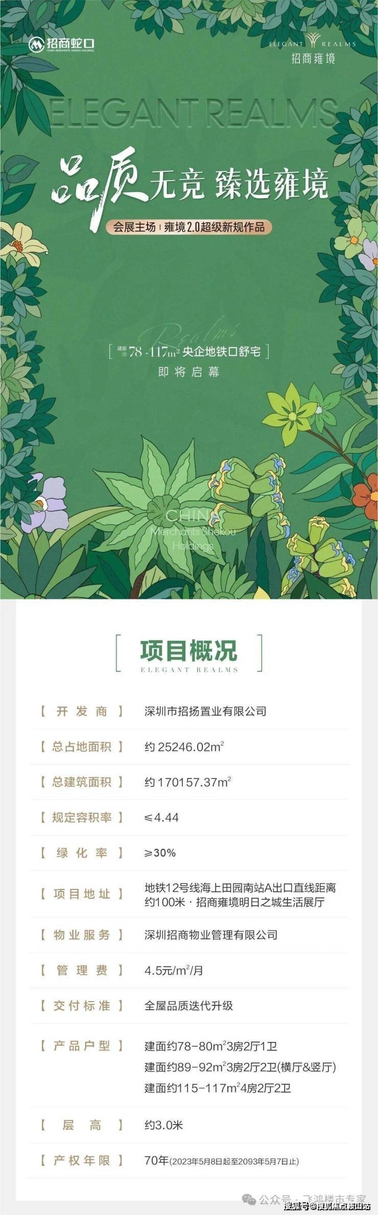 招商会展湾雍境名邸位于宝安沙井大前海会展湾片区的招商会展湾雍境名邸,本次是招商会展湾雍境二期,首推1栋3单元的195套房源,面积段有80㎡3房1卫,91㎡3房2卫,92㎡3房2卫3种户型,是3梯7户的普通高层,预计2027年9月精装交楼。