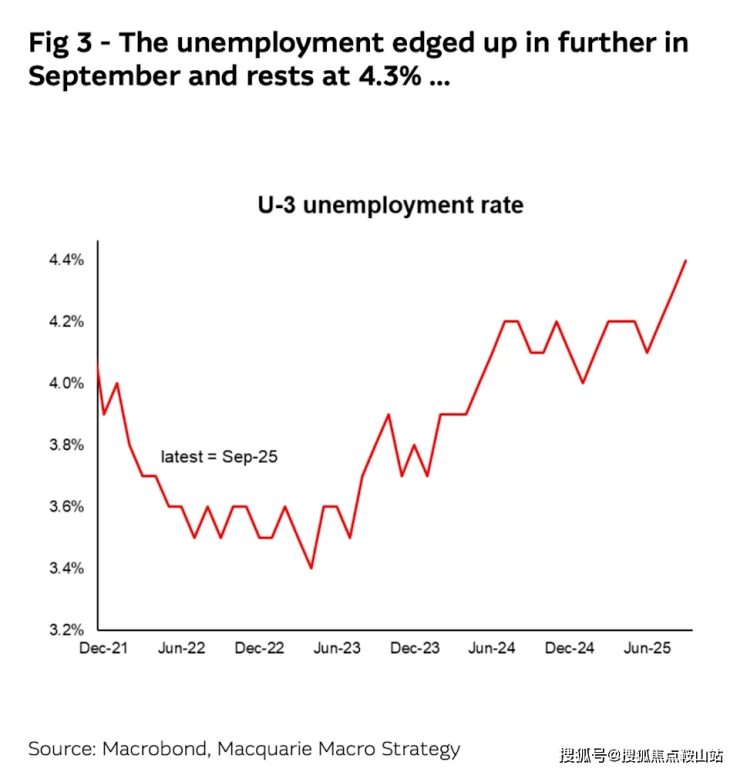 麦格理提供的图表显示,美国失业率正呈上升趋势: