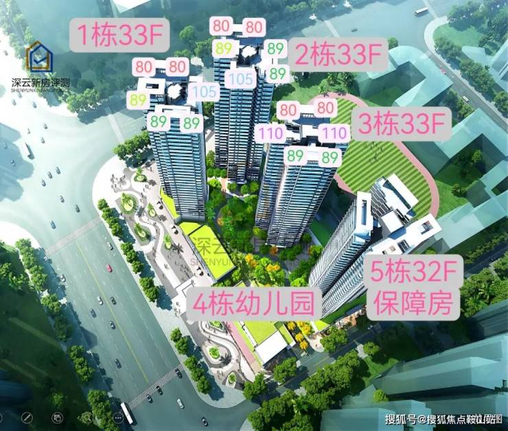 中建观玥占地约1.43万㎡,总建面约11.5万㎡,共由4栋总高32-33F住宅组成,其中1/2/3栋商品房33F,5栋商品房+保障房32F,4栋是1所6班制幼儿园。总规划820户,其中商品房719套,保障房101套(公租房+企业自持租赁住房),规划停车位约900个,容积率5.4。