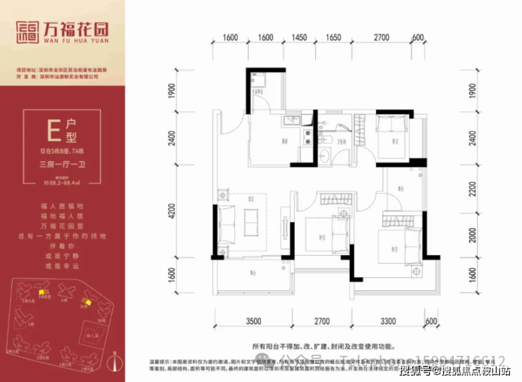 88㎡的3房2厅1卫,E户型(5栋B座/7栋A座02.03):设计的是竖厅格局,这个户型实际是能做到3房2卫的,客厅3.5米开间,动静分区,三开间朝南,3个卧室分别做到了3.3米/2.7米/2.7米的宽度,L型厨房,还带1个小生活阳台,得房率:75.39%(不含赠送),阳台朝南向。