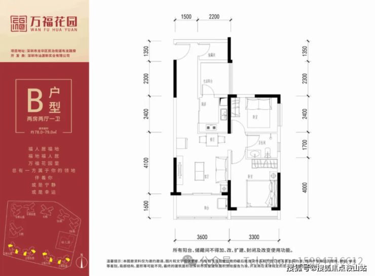 三、户型鉴赏[实用多功能户型空间]项目拥有1600套纯住宅大社区,主要以建筑面积约79-118㎡二至四房为主,大盘气象,更适合舒适居住生活;78㎡的2房2厅1卫,B户型(1/2栋02.05):设计的是竖厅格局,这个户型实际是可以做3房的,客厅3.6米开间,3个卧室分别做到了3.3米/2.4米/2.2米的宽度,L型厨房,得房率:78.36%(不含赠送),阳台西南或东南朝向。