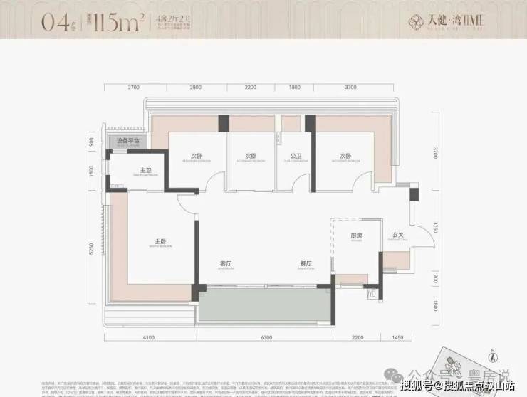 115㎡4房2卫,横厅户型,朝南看海,入户独立玄关,但三个次卧朝北;