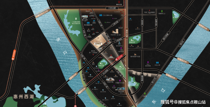 中盛遂晴府位于惠城江北菊花头片区,临东江,距华贸天地约 1.2km,地处江北文华一路边上,处于惠州江北 CBD 核心地段。周边生活配套异常完善,一路之隔有富民小学,直线 1 公里范围内还有惠州一中江北校区、东江高级中学、金裕小学等多所学校,能满足孩子全龄段的教育需求。佳兆业中心、市图书馆、市民公园等配套设施也皆在周边,居民吃喝玩乐购一应俱全。此外,项目紧邻三新北路主干道,交通出行十分便利。可以说,该楼盘占据了城市核心地段的区位优势,无论是生活氛围还是发展潜力都十分可观。