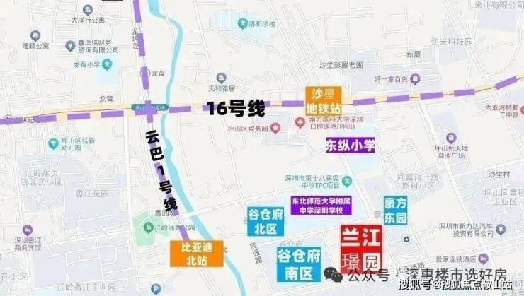 兰江璟园,位于坪山区石井街道比亚迪路豪方东园西侧,项目南侧是坪山比亚迪厂区,还有比亚迪六角大楼,西侧是方直谷仓府,北侧紧挨着东北师范大学附属中学深圳学校,16号地铁线“沙壆站”距离约400米。