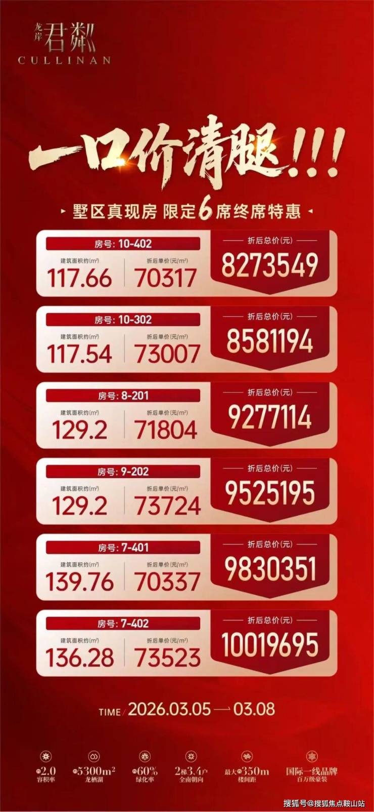 【公示单位】龙岸君粼开发商运营团队【公示日期】2026 年 3 月 6 日【服务承诺】本热线经开发商与搜狐平台双重审核,信息真实透明,购房全周期专人协助。