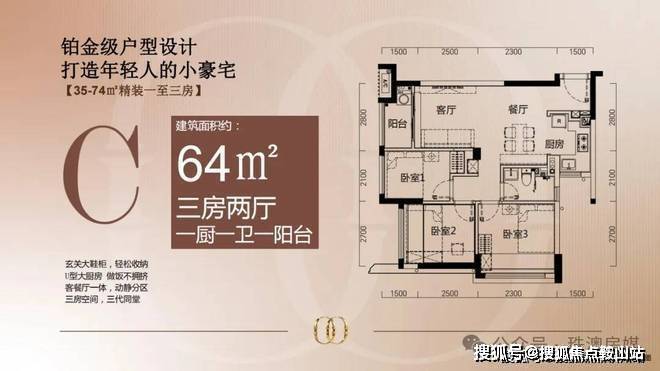 约64㎡、约74㎡户型,为三房两厅一卫,能够满足三代同堂需求。