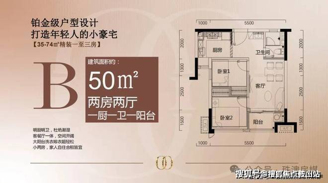约50㎡户型,则是两房设计,家人自住合租皆宜。