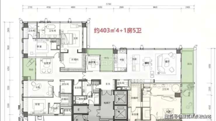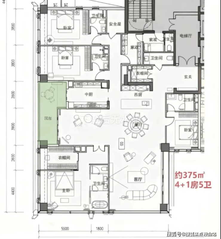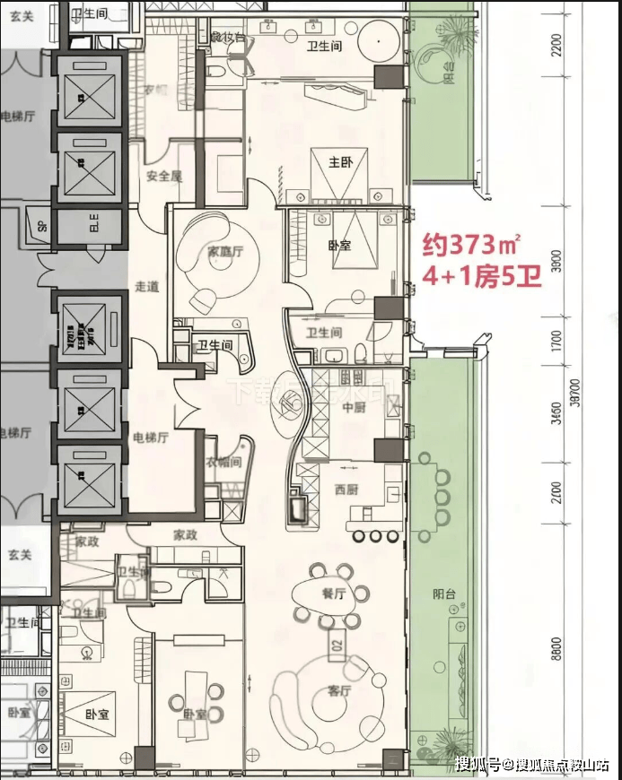 · 370-375㎡户型: 4+1房五卫设计,配备家庭厅和家政套间,适合有多样化生活需求的高净值家庭。
