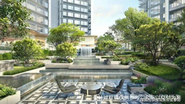 【飞瀑氧吧】:园林中庭巧妙利用高差,跌瀑、叠水、山石、树木等自然元素与中庭水苑、茶室等现代空间相互交织,营造典雅森系水院空间;