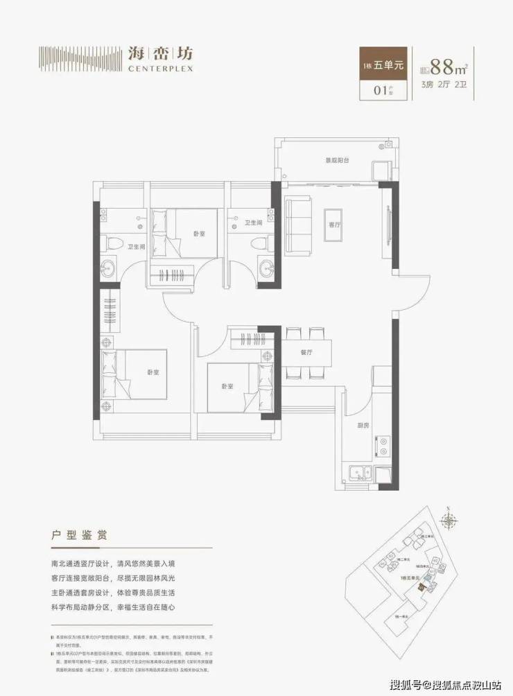 88㎡南北通的户型,分布在5单元的01和02,客厅西北向看花园,主卧东南向看凤凰天誉。88㎡横厅户型分布在2单元的01和02,东南朝向,餐厅视野会受楼体部分遮挡。