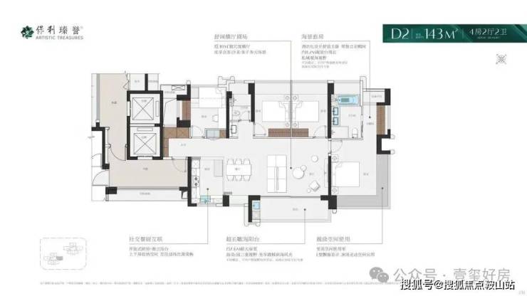 143㎡ 4+1房2卫,西南向(海景),南北通透,大横厅,采光好,但是电梯入户、公卫、餐厅分别与123㎡次卧、衣帽间、卫生间对视