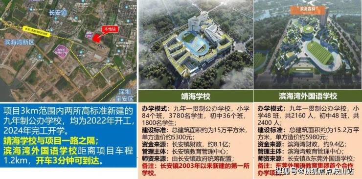 三大菁英教育:九年一贯制靖海学校(2022年10月动工)、东莞滨海湾外国语学校(预计2024年9月开学)、大湾区大学滨海湾校区(预计2023年动工);