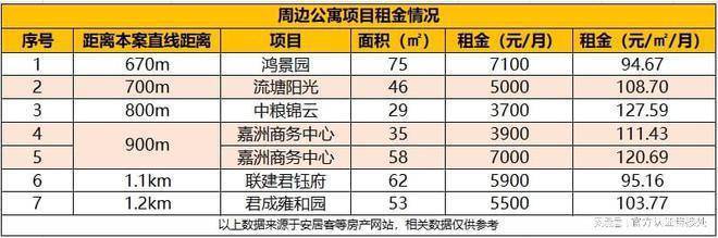 目前距离本项目约700m的45㎡产品的月租金可达5000元,同时周边73㎡产品的月租金可达7000元