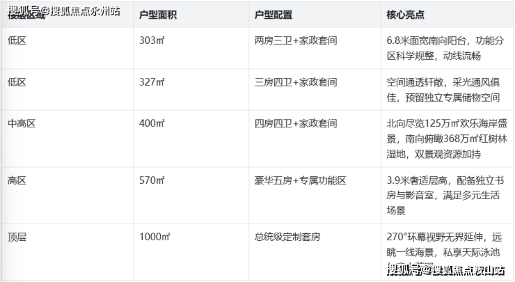 顶级户型:1032㎡超大平层,因270°环幕视野及一线景观优势,单价可达20万/㎡以上,总价突破1.5亿元,定位全球企业主与塔尖收藏者。