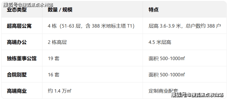 超高层公寓:4栋51-63层超高层,含388米地标主塔T1,总户数约300户,主打大平层产品,层高3.6-3.9米,远超普通豪宅标准。