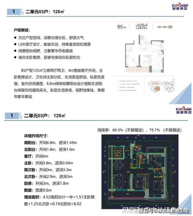 125㎡的3房2厅2卫:设计的是LDK竖厅格局,动静分区,客厅连接次卧巨幕阳台,三开间朝南,厨房带1个生活阳台,客厅阳台东南朝向。