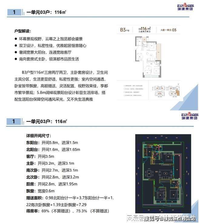 116㎡的3房2厅2卫:设计的是竖厅格局,客餐厅一体化,客厅连接次卧巨幕阳台,L型厨房,带1个生活阳台,主卧东南向,客厅阳台东北朝向。