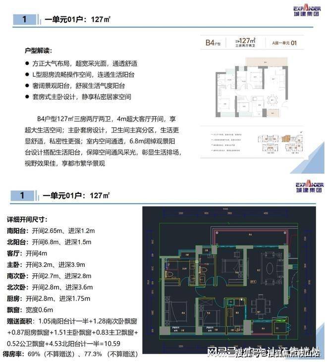 127㎡的3房2厅2卫:设计的是竖厅格局,南北通透双阳台,动静分区,客厅连接次卧巨幕阳台,L型厨房,客厅阳台主朝西北向。