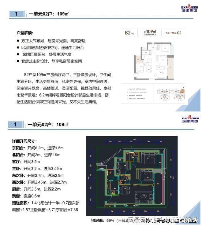 109㎡的3房2厅2卫:设计的是竖厅格局,客餐厅一体化,客厅连接次卧巨幕阳台,L型厨房,带1个生活阳台,客厅阳台东北朝向。