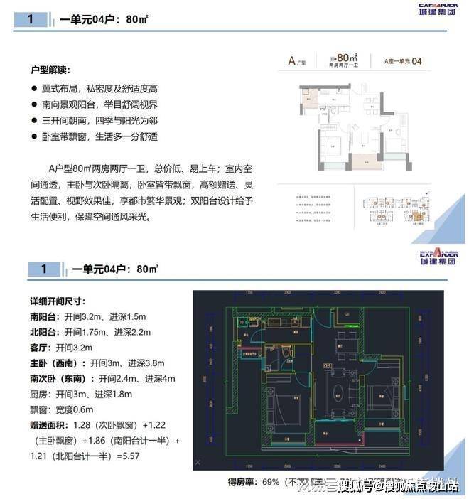 80㎡的2房2厅1卫:设计的是双龙抱珠格局,三开间朝南,一字型厨房,还带1个生活阳台,客厅阳台东南朝向。