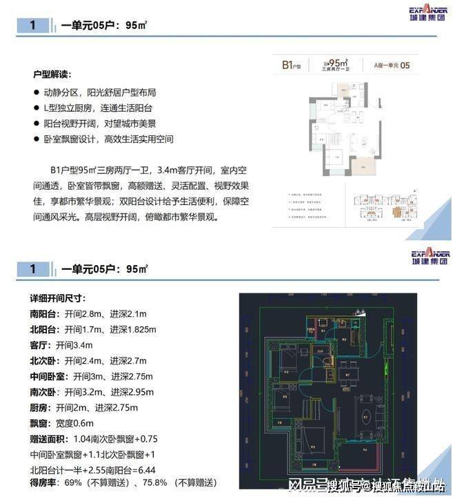 95㎡-3房2厅1卫:设计的是竖厅格局,客餐厅一体化,动静分区,L型厨房,带1个生活阳台,客厅阳台东南朝向。