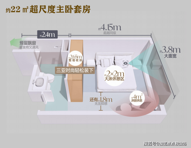 约22㎡主卧大套房,约3.8m南向面宽,全景飘窗,营造出开阔的空间感,晨曦午后,悦心私享天地。