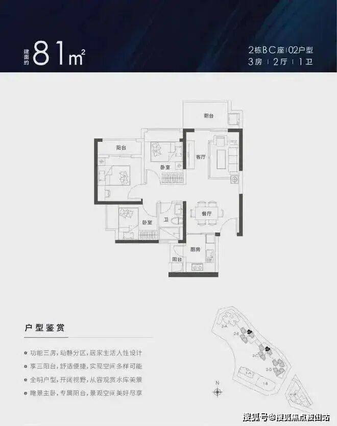 79-81㎡的3房2厅1卫,设计的竖厅格局,厨房带小阳台,客厅东北朝向,高层可看水库景观。