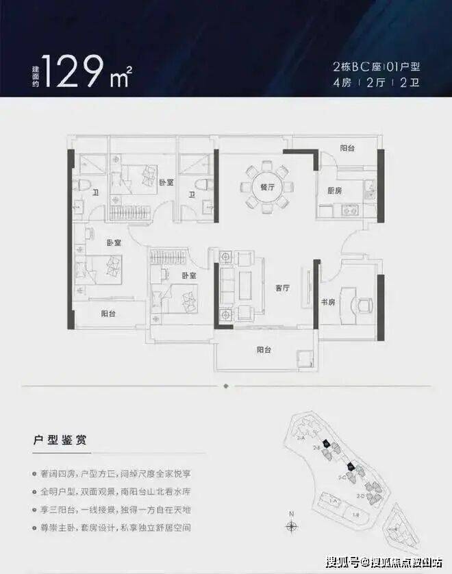 129㎡的4房2厅2卫,设计的竖厅南北通透格局,客厅主卧双阳台设计,厨房也带小阳台,客厅朝西南向,高层可享受双面景观。